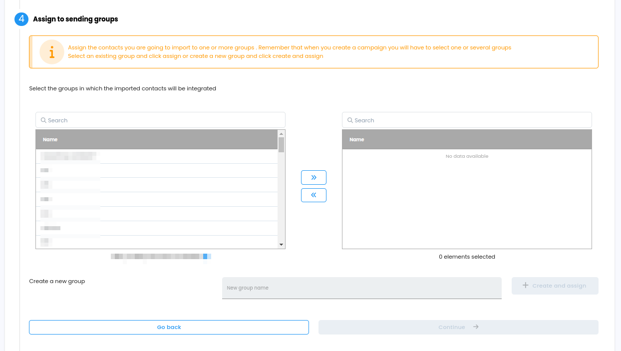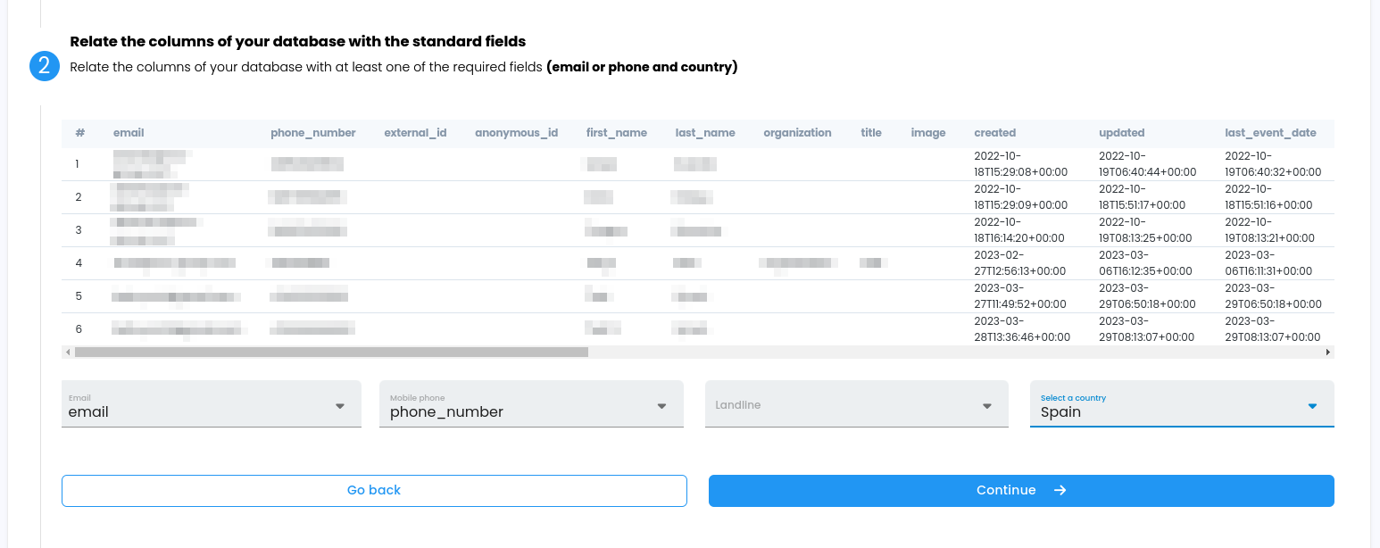 En este caso hemos seleccionado tanto la columna de email como una columna para el teléfono móvil del contacto. Seleccionamos el país al que pertenecen estos teléfonos móviles.