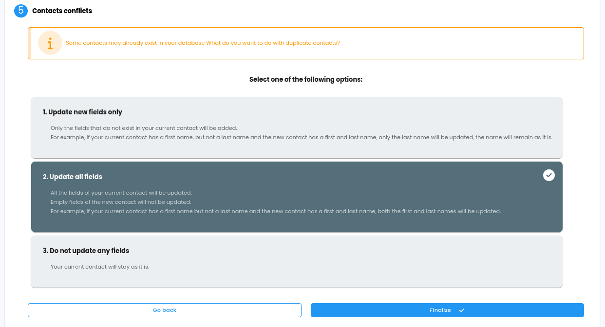 Se selecciona qué ha de hacer el importador cuando algunos de los contactos ya hayan sido importados con anterioridad en la plataforma en alguna de las importaciones anteriores.