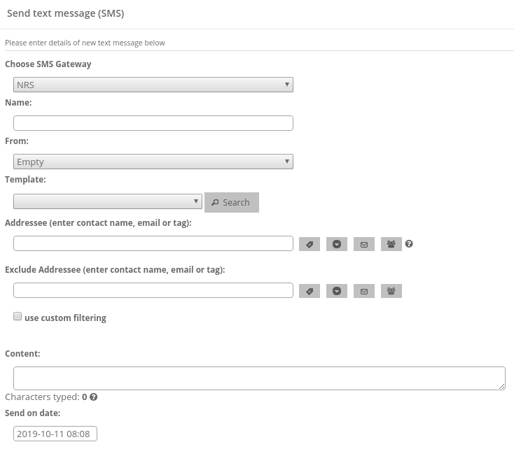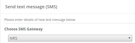 {{NAME}} (NRS) deve ser selecionado como Gateway. Insira o remetente e o texto do SMS. Também é possível enviar imediatamente quando o evento ocorrer ou enviá-lo posteriormente.