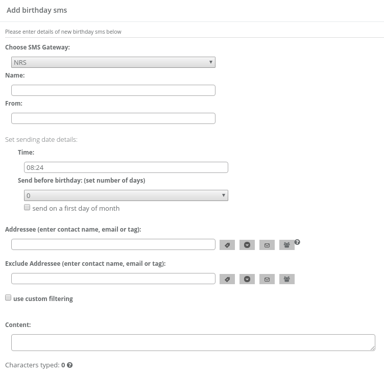 Os campos a serem preenchidos são praticamente os mesmos dos envios normal de SMS, excepto que, em vez de selecionar uma data específica, uma hora é selecionada e você pode especificar se deseja enviar no mesmo dia do aniversário, um dia antes ou vários dias antes. Isso significa que a data do envio dependerá do dia do aniversário do contacto.