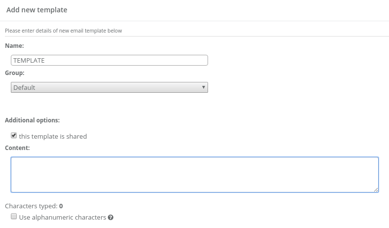 Digite um nome e o texto do SMS e pode ser usado como modelo no envio de SMS.